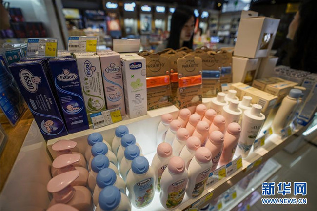 游客在中哈霍爾果斯國際邊境合作中心一家免稅店挑選化妝品(7月11日攝)。新華社記者 趙戈 攝