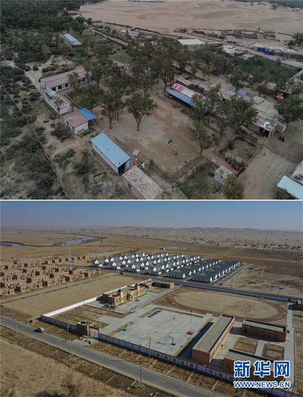 拼版照片:上圖為易地扶貧搬遷前的新疆于田縣達(dá)里雅布依鄉(xiāng)學(xué)校全景(2018年9月7日無人機(jī)拍攝);下圖為達(dá)里雅布依鄉(xiāng)易地扶貧搬遷安置點(diǎn)的學(xué)校新貌(2019年11月19日無人機(jī)拍攝)。新華社記者胡虎虎攝