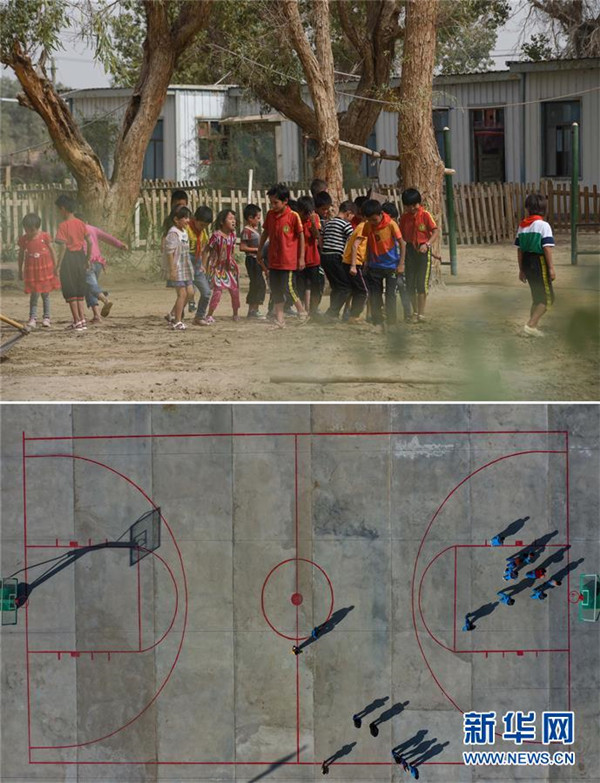拼版照片:上圖為學(xué)生利用課間時(shí)間在平整易地扶貧搬遷前的校園操場(chǎng)(2018年9月6日攝);下圖為學(xué)生們?cè)谟谔锟h達(dá)里雅布依鄉(xiāng)易地扶貧搬遷安置點(diǎn)的水泥操場(chǎng)上打籃球(2019年11月19日無人機(jī)拍攝)。新華社記者胡虎虎攝
