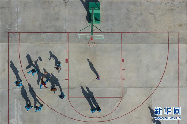 11月19日,在新疆于田縣達(dá)里雅布依鄉(xiāng)易地扶貧搬遷安置點(diǎn)的新學(xué)校,課間休息時(shí),孩子們?cè)谒嗖賵?chǎng)上打籃球。在該校位于塔克拉瑪干沙漠腹地的舊址,孩子們平時(shí)只能在沙土地上玩耍。新華社記者沈伯韓攝