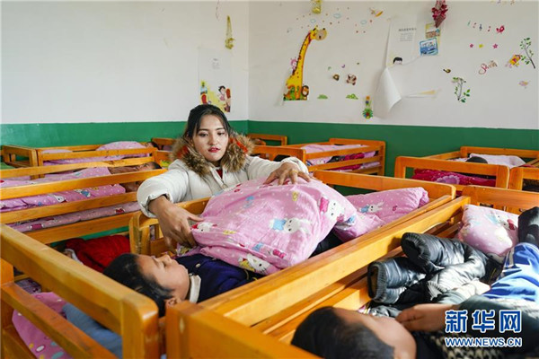 11月19日,在新疆于田縣達(dá)里雅布依鄉(xiāng)易地扶貧搬遷安置點(diǎn)的新幼兒園,老師依巴代提·買斯迪克在照顧中班的孩子們睡午覺。在該校位于塔克拉瑪干沙漠腹地的舊址,孩子們平時(shí)只能在大通鋪上休息,而在新校舍,每個(gè)孩子都有自己的木床睡。新華社記者沈伯韓攝