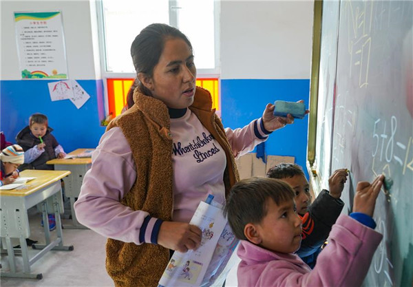 11月19日,在新疆于田縣達(dá)里雅布依鄉(xiāng)易地扶貧搬遷安置點(diǎn)的新學(xué)校,數(shù)學(xué)老師艾比拜木·吾布力艾山(中)在輔導(dǎo)一年級(jí)學(xué)生做計(jì)算題。新華社記者沈伯韓攝