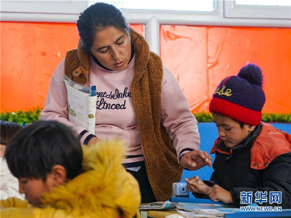 11月19日,在新疆于田縣達(dá)里雅布依鄉(xiāng)易地扶貧搬遷安置點(diǎn)的新學(xué)校,數(shù)學(xué)老師艾比拜木·吾布力艾山在輔導(dǎo)一年級(jí)學(xué)生做計(jì)算題。與該校位于塔克拉瑪干沙漠腹地的舊址相比,新校舍配備了更好的教學(xué)設(shè)備。新華社記者沈伯韓攝