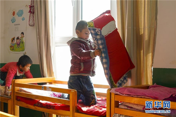 11月19日,在新疆于田縣達(dá)里雅布依鄉(xiāng)易地扶貧搬遷安置點(diǎn)的新幼兒園,中班孩子買買提·買和木提(右)整理枕頭被褥準(zhǔn)備睡午覺。在該校位于塔克拉瑪干沙漠腹地的舊址,孩子們平時(shí)只能在大通鋪上休息,而在新校舍,每個(gè)孩子都有自己的木床睡。新華社記者沈伯韓攝