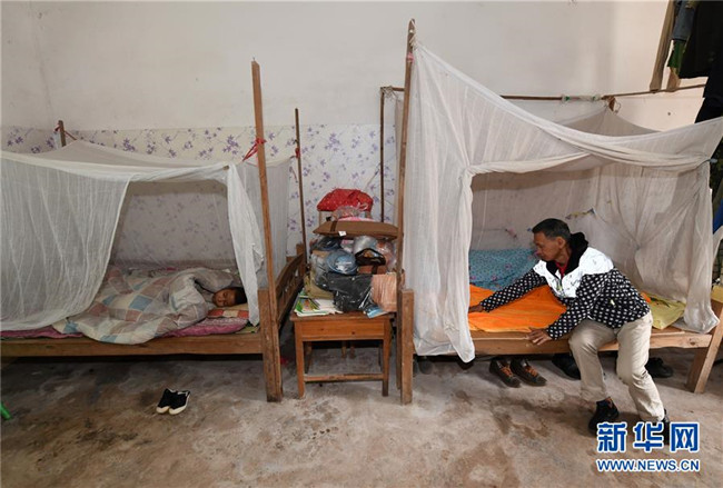 11月19日,在廣西上思縣那琴鄉(xiāng)中心小學(xué)逢通村教學(xué)點(diǎn),梁志雄在鋪?zhàn)约旱拇蹭仠?zhǔn)備午休。這個(gè)房間是梁志雄的辦公室兼臥室。新華社記者陸波岸攝