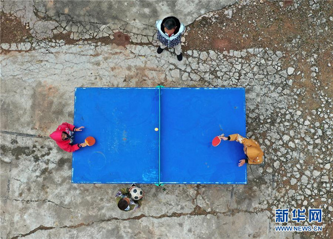 11月19日,在廣西上思縣那琴鄉(xiāng)中心小學(xué)逢通村教學(xué)點(diǎn),梁志雄教學(xué)生打乒乓球(無人機(jī)拍攝)。新華社記者陸波岸攝