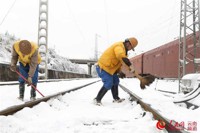 12月5日,云南省滇東北迎來今年以來首場降雪。昆鐵曲靖工務(wù)段及時啟動大雪天氣應急預案,成立除雪打冰隊,加強道岔除雪除冰工作。攝影:楊永全