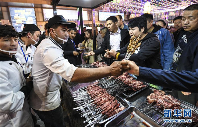 在烏魯木齊五一星光夜市,人們排隊(duì)購(gòu)買烤羊肉串等美食(5月6日攝)。 新華社記者 王菲 攝