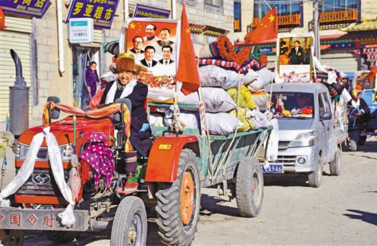 圖為打隆鎮(zhèn)邊境小康村群眾駕駛農(nóng)用車駛向幸福新家。記者 劉楓 攝