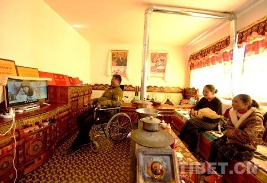 圖為安置點(diǎn)村民在家看電視 攝影:盧忠東 (圖片來自中國西藏網(wǎng))