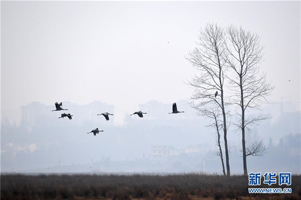 12月11日在貴州草海保護(hù)區(qū)拍攝的黑頸鶴。新華社記者楊文斌攝