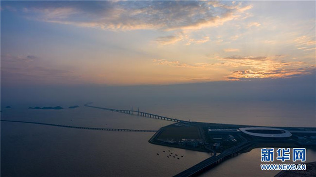 晨曦中的港珠澳大橋珠澳口岸人工島(10月24日無(wú)人機(jī)拍攝)。新華社記者 張金加 攝