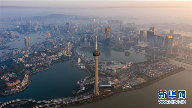 11月18日無(wú)人機(jī)拍攝的澳門(mén)旅游塔、西灣湖、南灣湖景色。新華社記者 張金加 攝