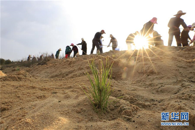 江西廬山市蓼南鄉(xiāng)組織村民在長(zhǎng)江流域鄱陽湖畔的沙洲上種植瞿麥。瞿麥?zhǔn)且晃吨兴幉?,不僅有固沙綠化作用,還具有較高的經(jīng)濟(jì)價(jià)值(4月12日攝)。新華社發(fā)(韓俊烜 攝)