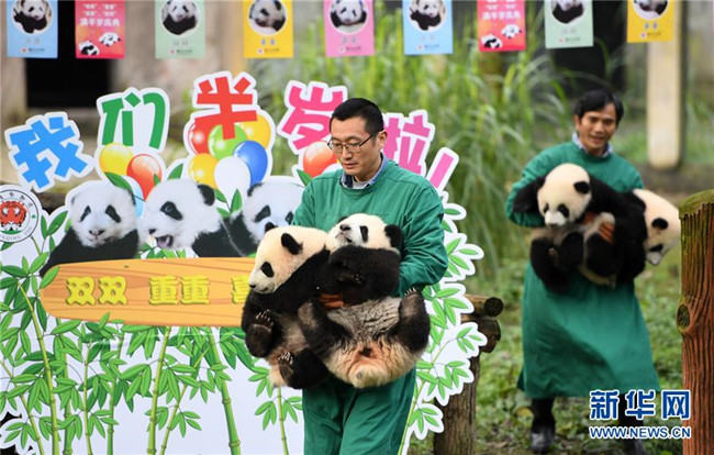 12月22日,重慶動物園4只半歲大熊貓在戶外活動。當日,重慶動物園為4只大熊貓寶寶“雙雙”“重重”“喜喜”“慶慶”舉行半歲生日慶?;顒?。4只半歲大熊貓在飼養(yǎng)員的照料下,在熊貓館運動場內(nèi)玩耍、嬉戲,與市民游客一同過冬至。新華社記者唐奕攝