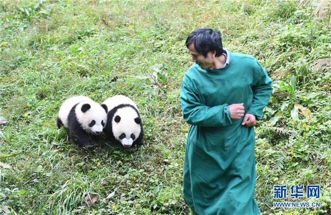 12月22日,飼養(yǎng)員引導大熊貓寶寶到戶外運動。當日,重慶動物園為4只大熊貓寶寶“雙雙”“重重”“喜喜”“慶慶”舉行半歲生日慶?;顒?。4只半歲大熊貓在飼養(yǎng)員的照料下,在熊貓館運動場內(nèi)玩耍、嬉戲,與市民游客一同過冬至。新華社記者唐奕攝