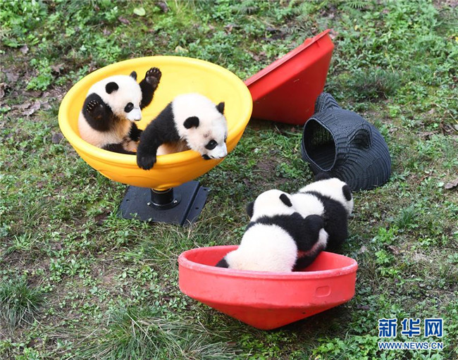 12月22日,重慶動物園4只半歲大熊貓在玩耍。當日,重慶動物園為4只大熊貓寶寶“雙雙”“重重”“喜喜”“慶慶”舉行半歲生日慶?;顒?。4只半歲大熊貓在飼養(yǎng)員的照料下,在熊貓館運動場內(nèi)玩耍、嬉戲,與市民游客一同過冬至。新華社記者唐奕攝