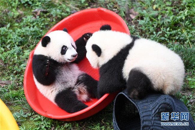 12月22日,重慶動物園兩只半歲大熊貓在玩耍。當日,重慶動物園為4只大熊貓寶寶“雙雙”“重重”“喜喜”“慶慶”舉行半歲生日慶?;顒?。4只半歲大熊貓在飼養(yǎng)員的照料下,在熊貓館運動場內(nèi)玩耍、嬉戲,與市民游客一同過冬至。新華社記者唐奕攝