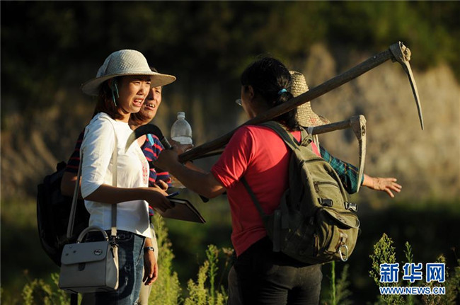 貴州省石阡縣坪山鄉(xiāng)大坪村監(jiān)委會(huì)主任左艷(左一)與下地勞作歸來(lái)的村民交談(2018年8月29日攝)。新華社記者 楊文斌 攝