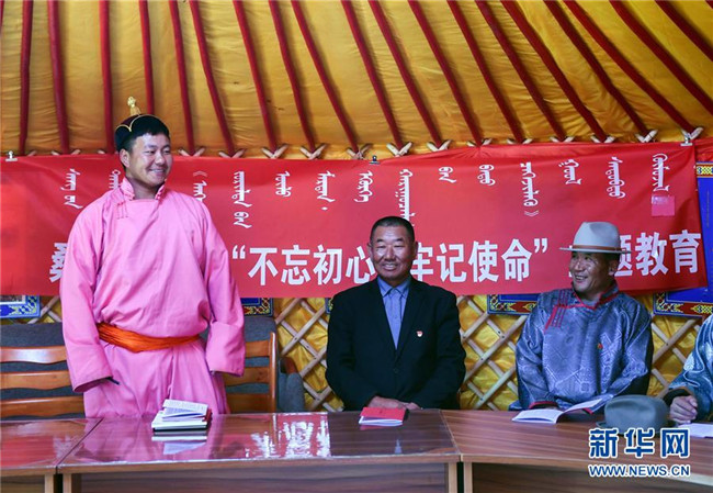 2019年10月11日,在內(nèi)蒙古自治區(qū)正藍(lán)旗恩克寶力格嘎查黨員中心戶的蒙古包中,黨員敖日格勒(左一)在回答知識(shí)競賽問題。新華社記者 劉磊 攝
