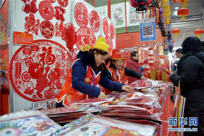 1月8日,商販在內(nèi)蒙古國(guó)際會(huì)展中心售賣窗花等年貨。新華社記者 王靖 攝