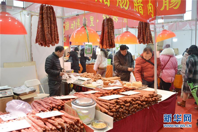 1月8日,消費(fèi)者在內(nèi)蒙古國(guó)際會(huì)展中心挑選香腸等年貨。新華社記者 王靖 攝