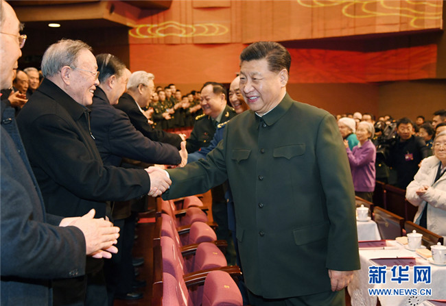 下午4時(shí)許,習(xí)近平來到老同志中間,全場響起熱烈掌聲。習(xí)近平同大家親切握手,關(guān)切詢問他們的身體和生活情況,共同回顧過去一年黨、國家、軍隊(duì)事業(yè)取得的重大成就。老同志們一致表示,要更加緊密地團(tuán)結(jié)在以習(xí)近平同志為核心的黨中央周圍,以習(xí)近平新時(shí)代中國特色社會(huì)主義思想為指導(dǎo),貫徹習(xí)近平強(qiáng)軍思想,貫徹新時(shí)代軍事戰(zhàn)略方針,堅(jiān)持政治建軍、改革強(qiáng)軍、科技強(qiáng)軍、人才強(qiáng)軍、依法治軍,不忘初心、牢記使命,銳意進(jìn)取、開拓創(chuàng)新,為實(shí)現(xiàn)國防和軍隊(duì)建設(shè)2020年目標(biāo)任務(wù),為奪取全面建成小康社會(huì)偉大勝利作出新的貢獻(xiàn)。