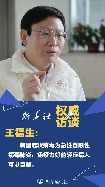 王福生:給大家普及一個概念,新型冠狀病毒肺炎它本身是一種急性自限性的疾病。什么叫自限性的呢?有的輕癥病人,他不經(jīng)過治療可以自己好,其它重癥病例通過治療才能恢復。這個過程中間,他有一種叫自己好的“自愈”,所以說我覺得“自愈”加上“治愈”,如果他癥狀輕,肺部的病變不嚴重,免疫力又比較好,這樣通過自身抗病毒的能力,就很快地把病毒控制了,但這可能得有3周左右。