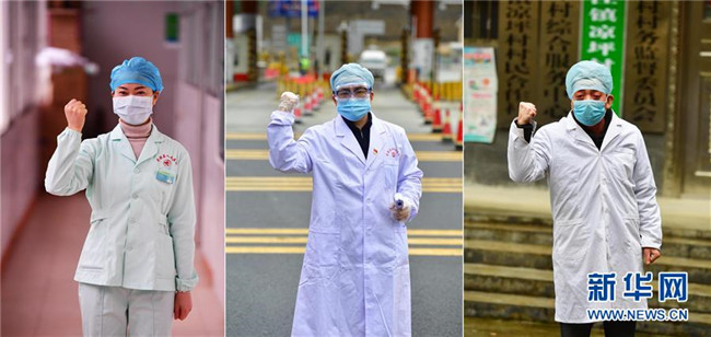 參與防疫工作的粟萬龍(中)、楊紅英(左)夫妻和哥哥粟從軍(拼版照片,2月8日攝)。