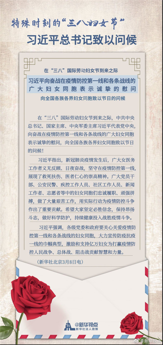 在“三八”國(guó)際勞動(dòng)?jì)D女節(jié)到來(lái)之際,中共中央總書(shū)記、國(guó)家主席、中央軍委主席習(xí)近平代表黨中央,向奮戰(zhàn)在疫情防控第一線和各條戰(zhàn)線的廣大婦女同胞表示誠(chéng)摯的慰問(wèn),向全國(guó)各族各界婦女同胞致以節(jié)日的問(wèn)候!