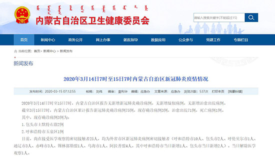 3月15日,記者從內(nèi)蒙古自治區(qū)衛(wèi)生健康委員會(huì)獲悉,2020年3月14日7時(shí)至15日7時(shí),內(nèi)蒙古自治區(qū)報(bào)告無新增新冠肺炎確診病例,無新增疑似病例,無新增治愈出院病例。
