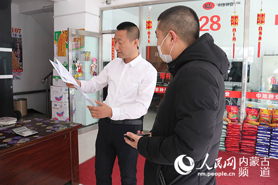 3月10日,內(nèi)蒙古興安盟扎賚特旗種子管理站副站長(zhǎng)史磊(右)發(fā)放監(jiān)管告知書(shū)。李敏 攝