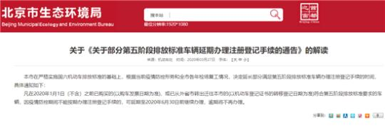 近日,北京市生態(tài)環(huán)境局發(fā)布《關(guān)于<關(guān)于部分第五階段排放標(biāo)準(zhǔn)車輛延期辦理注冊(cè)登記手續(xù)的通告>的解讀》指出,凡在2020年1月1日之前已購(gòu)買(mǎi)的、或已從外省市轉(zhuǎn)出遷往本市的符合“國(guó)五”排放標(biāo)準(zhǔn)要求的車輛,因疫情防控期間不能按期辦理注冊(cè)登記手續(xù)的,可延期至2020年6月30日前繼續(xù)辦理,逾期將不再辦理。
