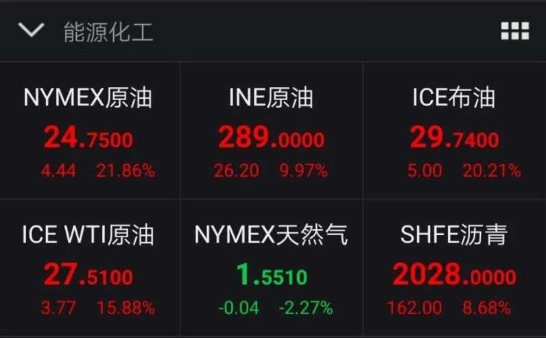 4月2日,國(guó)際原油期貨價(jià)格出現(xiàn)暴漲,美國(guó)WTI原油期貨盤(pán)中最高漲超30%,布倫特原油期貨盤(pán)中最高漲超46%。截至收盤(pán),美國(guó)WTI 原油期貨價(jià)格漲幅24.67%,報(bào)25.32美元/桶;布倫特原油期貨漲幅21.02%,報(bào)29.94美元/桶,均為史上最大單日漲幅。(張旭)