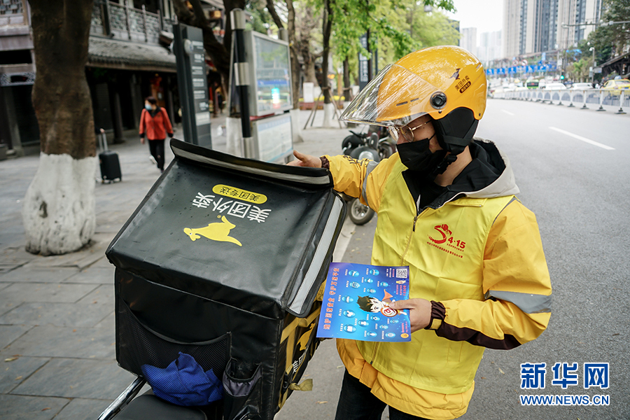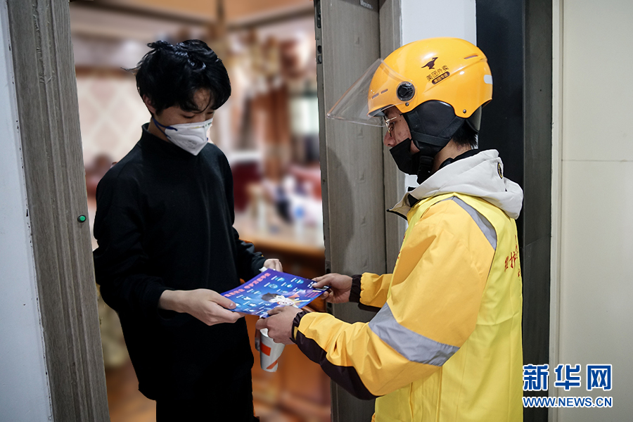 到達(dá)送餐的小區(qū)后,王淞迅速跟對(duì)方取得聯(lián)系,上門進(jìn)行配送。據(jù)沙坪壩區(qū)委政法委相關(guān)負(fù)責(zé)人介紹,通過快遞和外賣配送業(yè)務(wù)來發(fā)送宣傳制品,是為了讓宣傳教育活動(dòng)由人員聚集到分散入戶,變集中宣傳為流動(dòng)宣傳,同時(shí)不降低疫情期間群眾參與度。新華網(wǎng) 韓夢(mèng)霖 攝