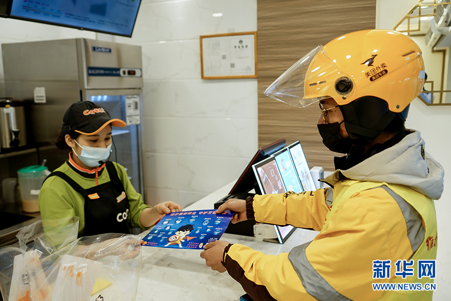 王淞在取餐前,先將一份宣傳海報(bào)交給了配餐的商家。這是他今天的第9個(gè)訂單,王淞覺得參加這樣的活動(dòng)十分有意義,讓自己在送餐掙錢之外又多了一份社會(huì)責(zé)任感。新華網(wǎng) 韓夢(mèng)霖 攝