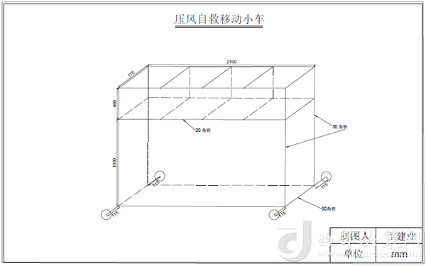 圖紙畫好后,王建業(yè)火速發(fā)給了材料員老王,老王憑借多年的人脈,在車間找來電焊師傅,又拾了廢棄的幾塊角鋼和幾個車輪,半晌就把王建業(yè)想要的東西給做了出來。其實很簡單,根據(jù)壓風自救箱的尺寸,利用扁鐵構(gòu)建整體框架,下方安裝四個滑輪即可投入使用。