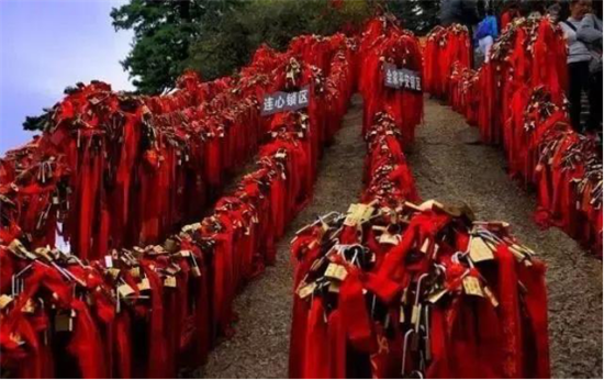 華山是愛情山。“洞房”一詞就源于華山西峰。相傳春秋時(shí)期在華山修行的吹簫人簫史和秦穆公的女兒弄玉就是在華山西峰相識(shí)相愛,由于山上沒有房屋,就在崖壁上鑿洞成婚,“洞房”一詞由此誕生。 如今來愛情山的游客都有了一個(gè)約定俗成的習(xí)慣,“進(jìn)山先拜廟,相愛神知道”。一把連心鎖,鎖定你和我”。相愛的情侶,不分年齡,不分國(guó)籍,不分信仰,來到山上都要進(jìn)香上鎖,讓華山見證彼此的真心與愛意,祈求幸福美滿,人生甜蜜。