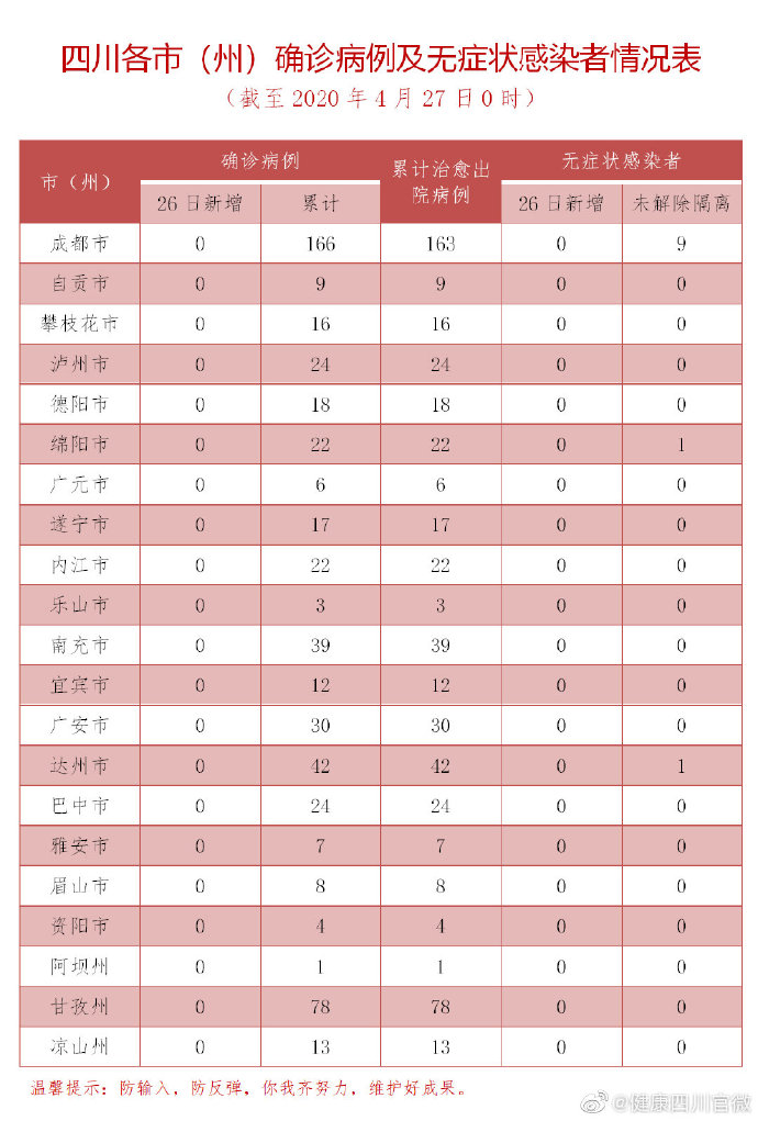 記者從四川省衛(wèi)健委獲悉,4月26日0-24時,四川無新增新型冠狀病毒肺炎確診病例,無新增疑似病例,157人尚在接受醫(yī)學觀察。