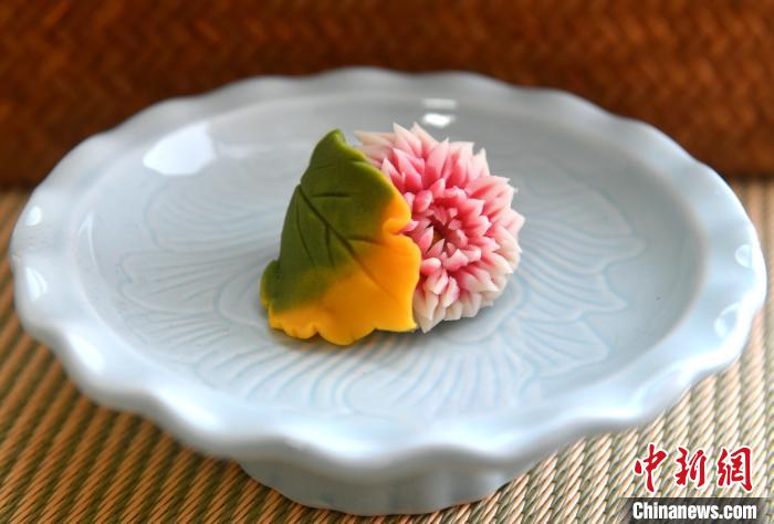 半個小時后,一個精致的菊花造型和果子呈現(xiàn)在眼前。不及巴掌大的和果子令人食指大動,既想仔細觀賞,又想品嘗一下它的味道。