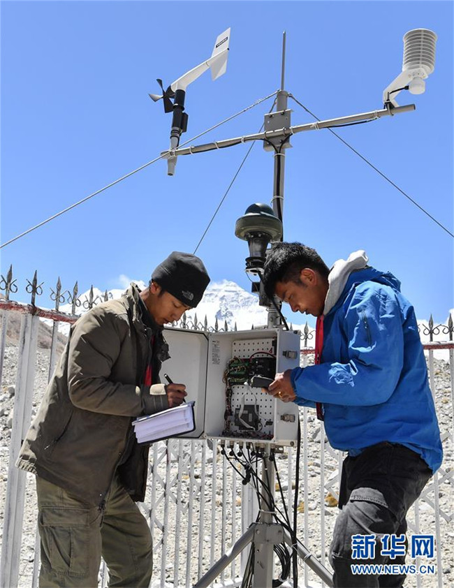 當(dāng)日,西藏自治區(qū)氣象局工作人員在珠峰大本營的自動氣象站校準(zhǔn)觀測儀器、比對觀測數(shù)據(jù),為2020珠峰高程測量活動提供氣象保障。