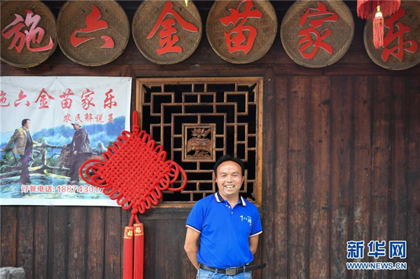 這是施六金在他的農(nóng)家樂前留影(4月25日攝)。1973年出生于十八洞村的施六金,由于父親患病很早就放棄學(xué)業(yè)和母親扛起了家庭的重擔。為了生活,他還曾遠去東南亞打工。2015年,看到家鄉(xiāng)的變化,施六金回到村里開起了農(nóng)家樂,年度家庭人均純收入也從2014年的1715元增長到了2019年的35696元。2018年,施六金與心愛的人組建了家庭。今年初,施六金與愛人迎來了一個大胖小子。“做人做事要懂得回報和感恩。”施六金給剛出生的兒子取名施澤恩。新華社記者薛宇舸攝