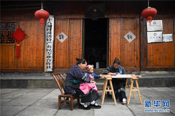 吳美金(右一)在十八洞村苗繡特產(chǎn)農(nóng)民專業(yè)合作社繡苗繡(4月24日攝)。1967年出生的吳美金,1992年嫁入飛蟲村(現(xiàn)十八洞村飛蟲寨)時,只有爛泥路的飛蟲村不僅田土少,掙錢活路也少,生活十分困難。2014年,吳美金加入了十八洞村苗繡特產(chǎn)農(nóng)民專業(yè)合作社,從小就會的苗繡傳統(tǒng)手藝如今成了家庭增收的法寶,不僅在家門口就把錢掙了,同時還能照顧年幼的孫子孫女。“現(xiàn)在的日子,比年輕的時候好多了。”吳美金說。新華社記者薛宇舸攝