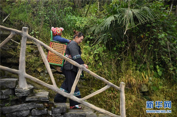 吳美金背著孫子走在十八洞村中,準備前往村里的苗繡合作社(4月24日攝)。1967年出生的吳美金,1992年嫁入飛蟲村(現(xiàn)十八洞村飛蟲寨)時,只有爛泥路的飛蟲村不僅田土少,掙錢活路也少,生活十分困難。2014年,吳美金加入了十八洞村苗繡特產(chǎn)農(nóng)民專業(yè)合作社,從小就會的苗繡傳統(tǒng)手藝如今成了家庭增收的法寶,不僅在家門口就把錢掙了,同時還能照顧年幼的孫子孫女。“現(xiàn)在的日子,比年輕的時候好多了。”吳美金說。新華社記者薛宇舸攝