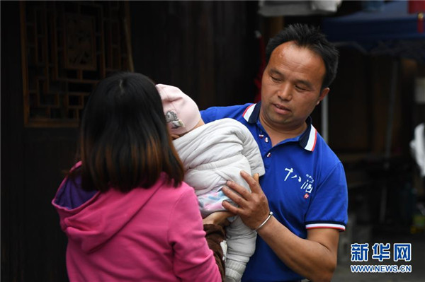 施六金(右)從妻子手中接過兒子施澤恩(4月25日攝)。1973年出生于十八洞村的施六金,由于父親患病很早就放棄學(xué)業(yè)和母親扛起了家庭的重擔。為了生活,他還曾遠去東南亞打工。2015年,看到家鄉(xiāng)的變化,施六金回到村里開起了農(nóng)家樂,年度家庭人均純收入也從2014年的1715元增長到了2019年的35696元。2018年,施六金與心愛的人組建了家庭。今年初,施六金與愛人迎來了一個大胖小子。“做人做事要懂得回報和感恩。”施六金給剛出生的兒子取名施澤恩。新華社記者薛宇舸攝