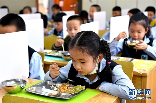 5月11日,陜西省西安市新城區(qū)后宰門小學(xué)一年級(jí)的學(xué)生在吃午飯。新華社記者 劉瀟 攝