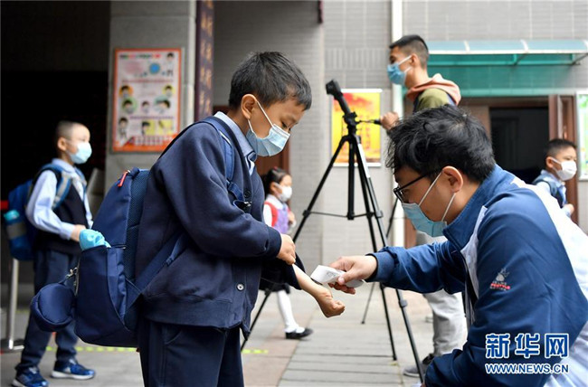 5月11日,陜西省西安市新城區(qū)后宰門小學(xué)的學(xué)生進(jìn)校時(shí)測(cè)量體溫。新華社記者 劉瀟 攝
