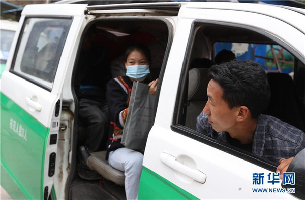 5月12日,在四川省昭覺(jué)縣阿土列爾村,莫色雄體(右)坐上車準(zhǔn)備前往昭覺(jué)縣易地扶貧搬遷縣城集中安置點(diǎn)的新家。新華社記者江宏景攝