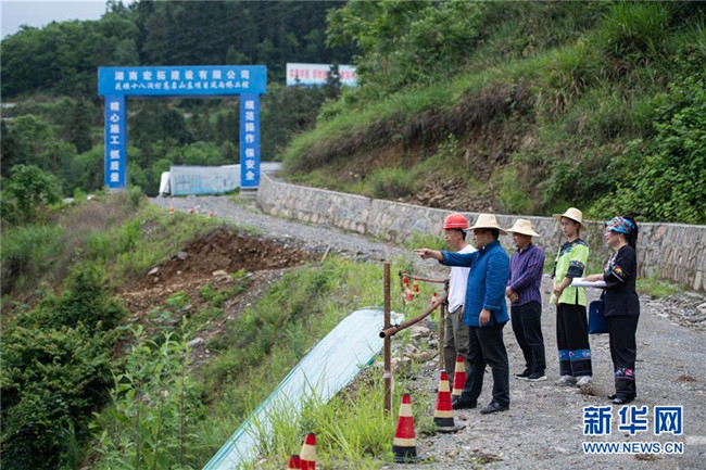 5月15日,在湘西十八洞村溶洞開發(fā)工地,麻輝煌(左二)和村干部進(jìn)行施工規(guī)劃。新華社發(fā)(陳思汗攝)