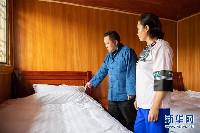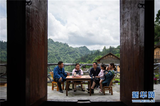 5月15日,在湘西十八洞村,麻輝煌(左)在村民楊慧英家了解民宿建設(shè)情況。新華社發(fā)(陳思汗攝)